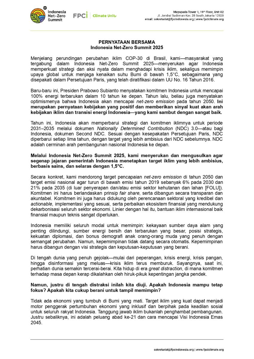 Menjelang perundingan perubahan iklim COP-30 di Brasil, kami—masyarakat yang tergabung dalam Indonesia Net-Zero Summit 2025—menyerukan agar Indonesia memperkuat strategi dan aksi nyata dalam menghadapi krisis iklim, sekaligus memimpin upaya global untuk menjaga kenaikan suhu Bumi di bawah 1,5°C, sebagaimana yang disepakati dalam Persetujuan Paris, yang telah diratifikasi dalam UU No. 16 Tahun 2016.