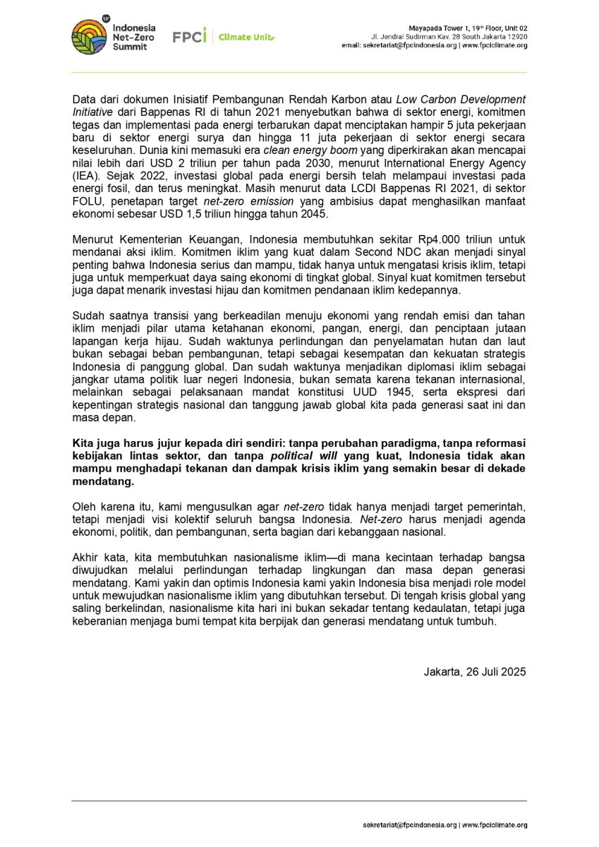Tidak ada ekonomi yang tumbuh di Bumi yang mati. Target iklim yang kuat dapat menjadi motor penggerak pertumbuhan ekonomi yang inklusif dan berpihak pada keadilan sosial untuk seluruh rakyat Indonesia. Tanggung jawab iklim bukanlah penghambat pembangunan. Justru sebaliknya, ini adalah peluang abad ke-21 dan cara mencapai Visi Indonesia Emas 2045.