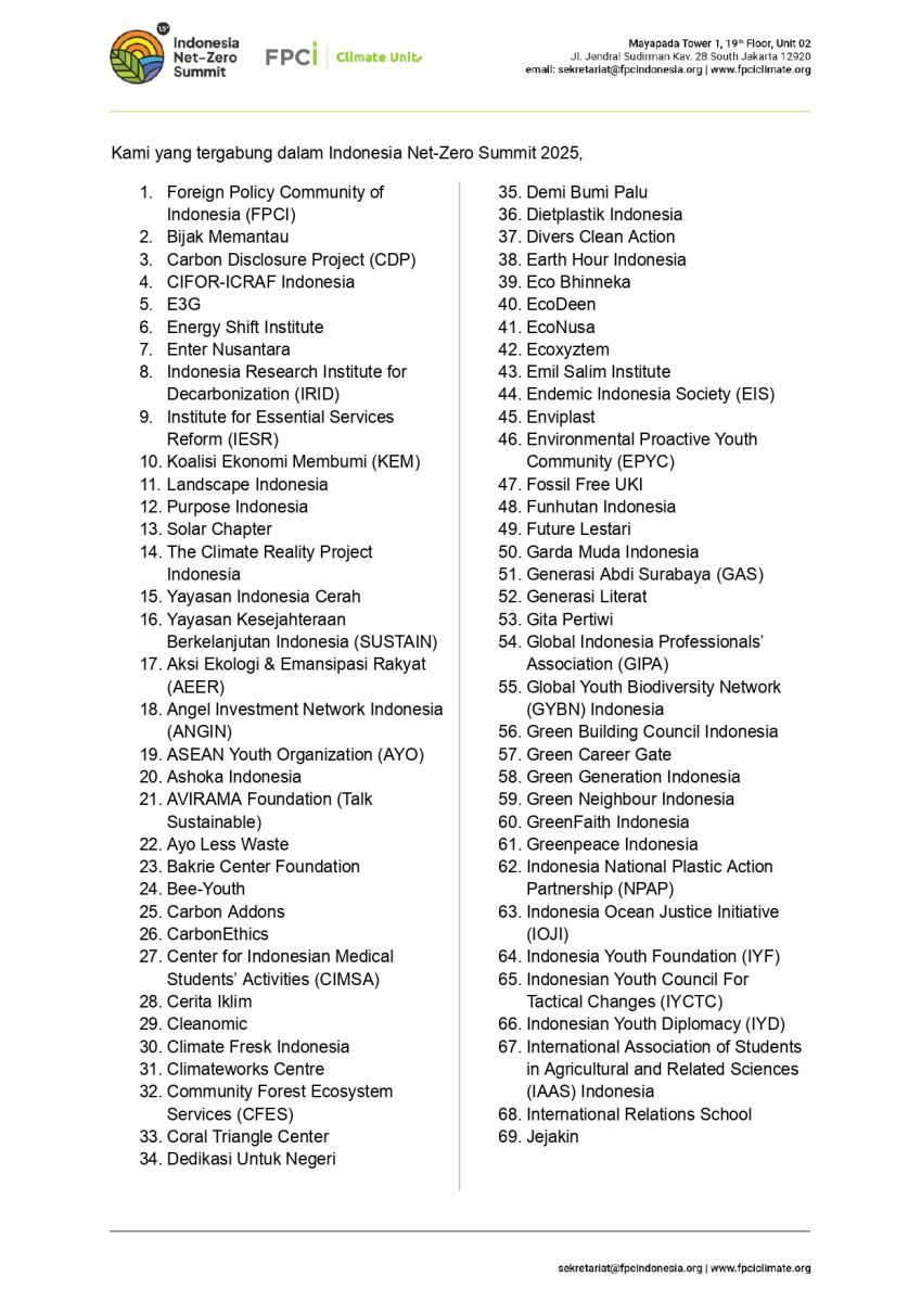 Melalui Indonesia Net-Zero Summit 2025, kami menyerukan dan mengusulkan agar segenap jajaran pemerintah Indonesia menetapkan target iklim yang lebih ambisius, berbasis sains, dan selaras dengan 1,5°C.