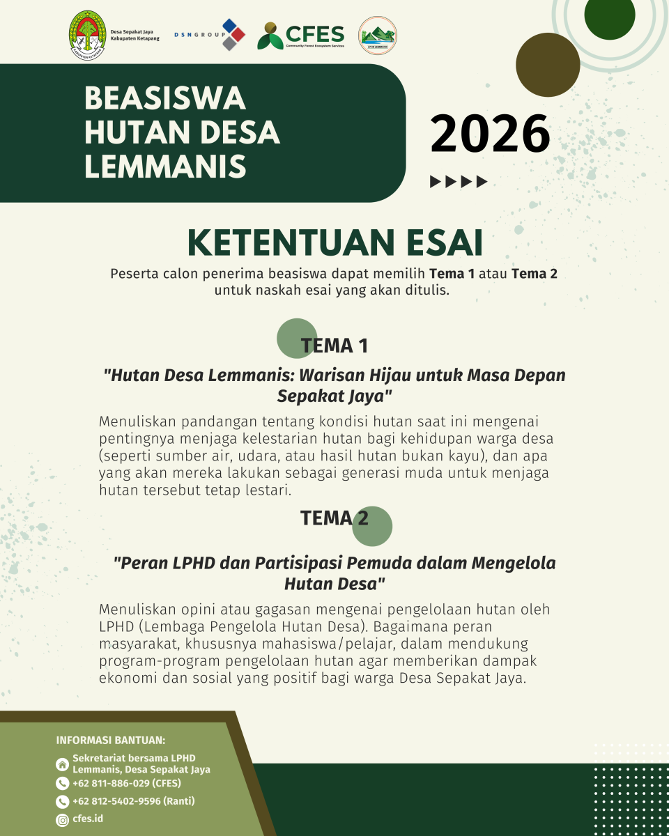 Persyaratan dapat dikirimkan melalui e-mail beasiswa@cfes.id dengan subjek: Beasiswa HD Lemmanis 2026. Informasi pendaftaran lebih lanjut dapat mengunjungi Sekretariat bersama LPHD Lemmanis Desa Sepakat Jaya atau menghubungi nomor resmi yang tertera pada brosur.